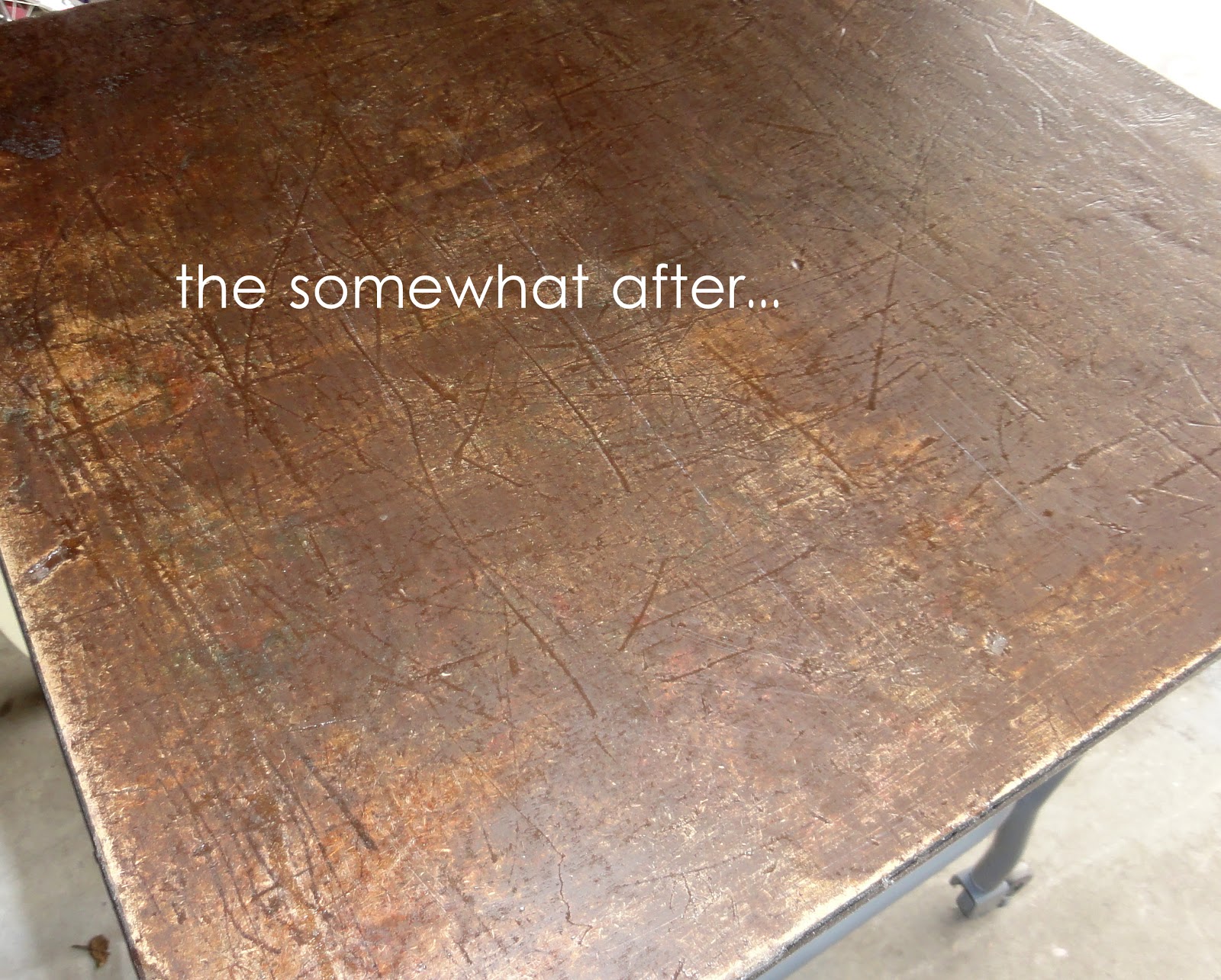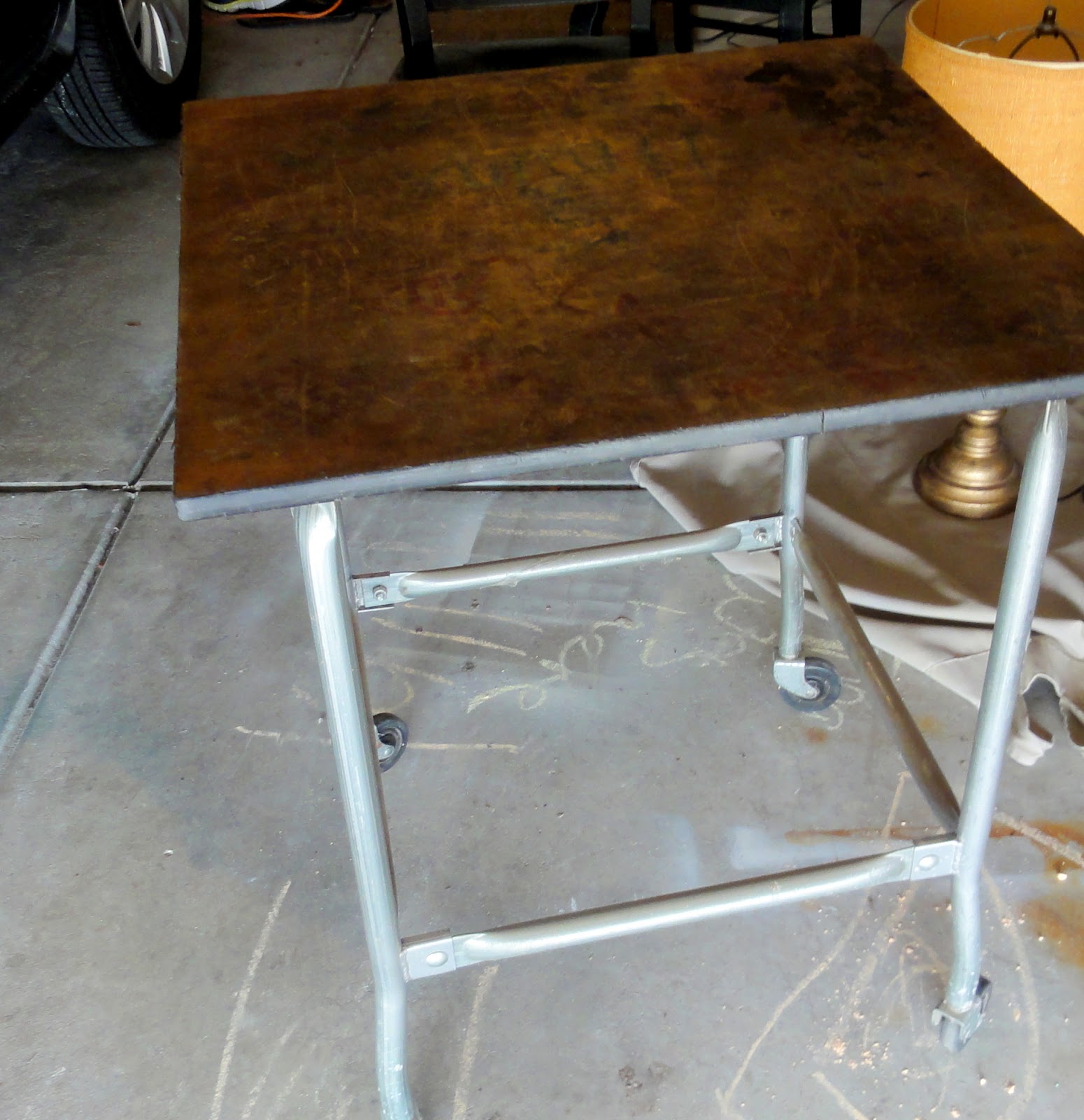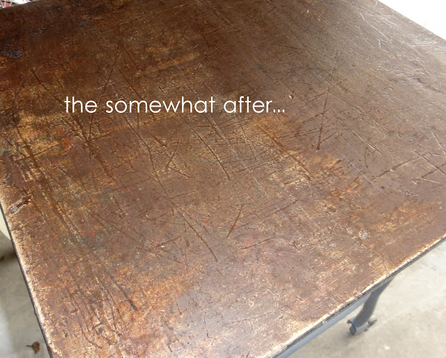 So then I quickly wiped off what spray paint I could from the top of the table I had just sprayed. I waited for the remnants to dry and sanded the top of the table again. And here is what it looked like: