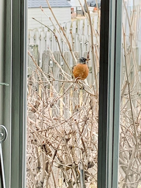 There’s a robin that keeps coming to our family room window daily and looks in. They peck on the window, chirp into the house, or just sit on the bush and stay for a couple of minutes. A cardinal came to our yard the other day and a mourning dove was sitting on our front porch after a long walk last week.