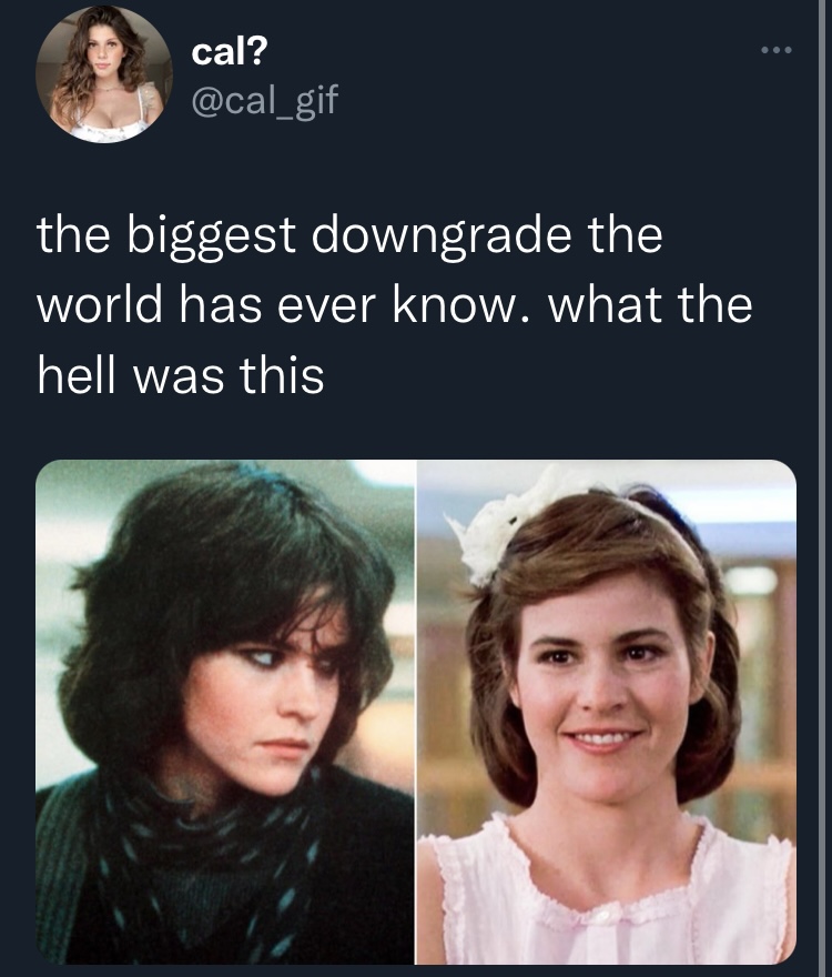 I like everything here, of course. Because you saved it and have the good sense to remember that you saved it, which is often my downfall when saving things on my phone, things I find months later. I especially like the “Thank you for saying it” photo of Ally Sheedy in The Breakfast Club. I never liked that makeover.
