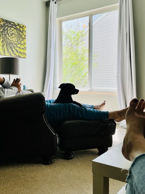 Buddy was looking out the window as my husband was taking Biscuits to get his nails trimmed.
