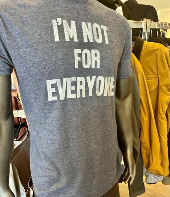 The I am not for everyone shirt was in a shop and it was a ridiculous price, like 70 bucks. I found one similar online for 11.99 here: https://www.crazydogtshirts.com/products/im-not-for-everyone-mens-tshirt?gclid=CjwKCAjwjMiiBhA4EiwAZe6jQ_dao9JJcEjKGW70H9C9a7UL3a4dha90HmU3fWF70beIM4F-3GKytxoC4cQQAvD_BwE