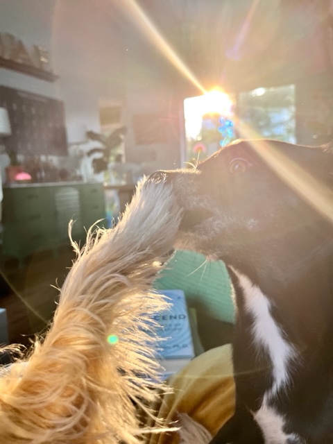 I love seeing the pics of your dogs! I don’t mind the idea of losing another dog, I just don’t feel able to make the long-term commitment that comes with a dog. I’ve become aware of an organization near us that fosters old dogs who need a home, and I’m very interested in that. Not right now–just too much going on with family. But I really love the idea of taking in an old dog who needs someone to care for them. The organization’s web site says prospective fosters should think of it as providing hospice; most dogs don’t live more than a year. Maybe that’s a way of protecting myself from the grief that comes from loving a dog through its life? I dunno. Love and grief are beautiful mysteries to me.