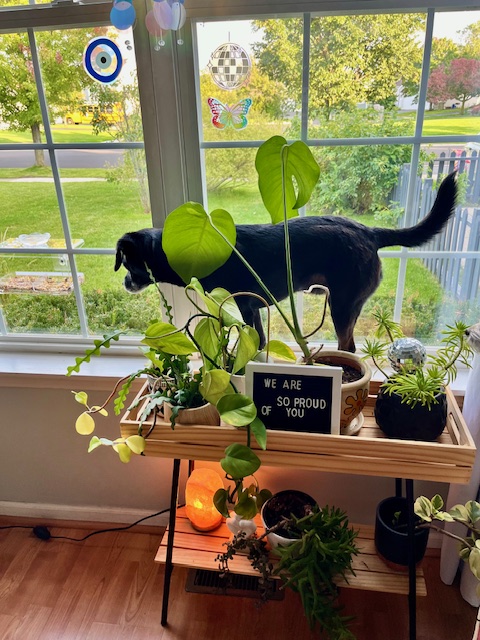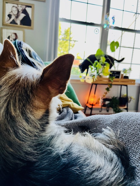 Buddy has always thought he was a cat! When I’m in Anna’s old room, he’s usually with us (Biscuits and me), but when we’re downstairs, he’s always waiting for the chipmunk. 😂🖤
