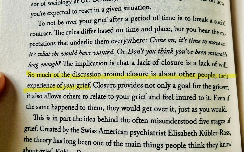 The first book excerpt about another’s closure about one’s grief reminded me of a friend who’s a trauma counsellor (and she knows trauma, having lost a child in a school shooting); she has told people about Ring Theory, mostly for self-preservation. If you haven’t heard about it, you may want to read this article: https://www.psychologytoday.com/us/blog/promoting-hope-preventing-suicide/201705/ring-theory-helps-us-bring-comfort-in (the link is a bit misleading; it’s not about suicide).