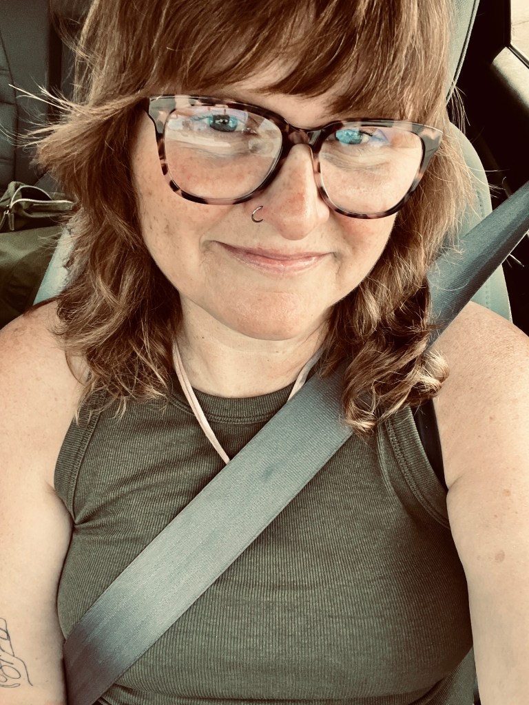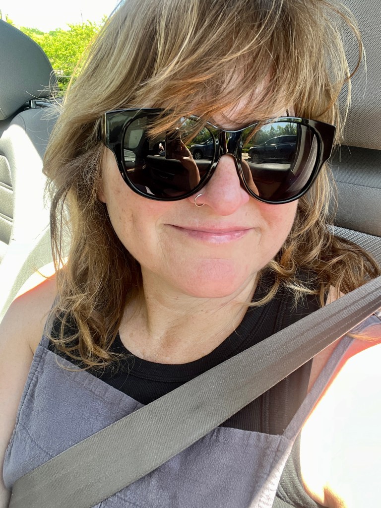 on the way home from getting new glasses, and having another good hair day. side note: i haven’t had one of those in a long time. it’s either grief or menopause, but i miss having good hair.