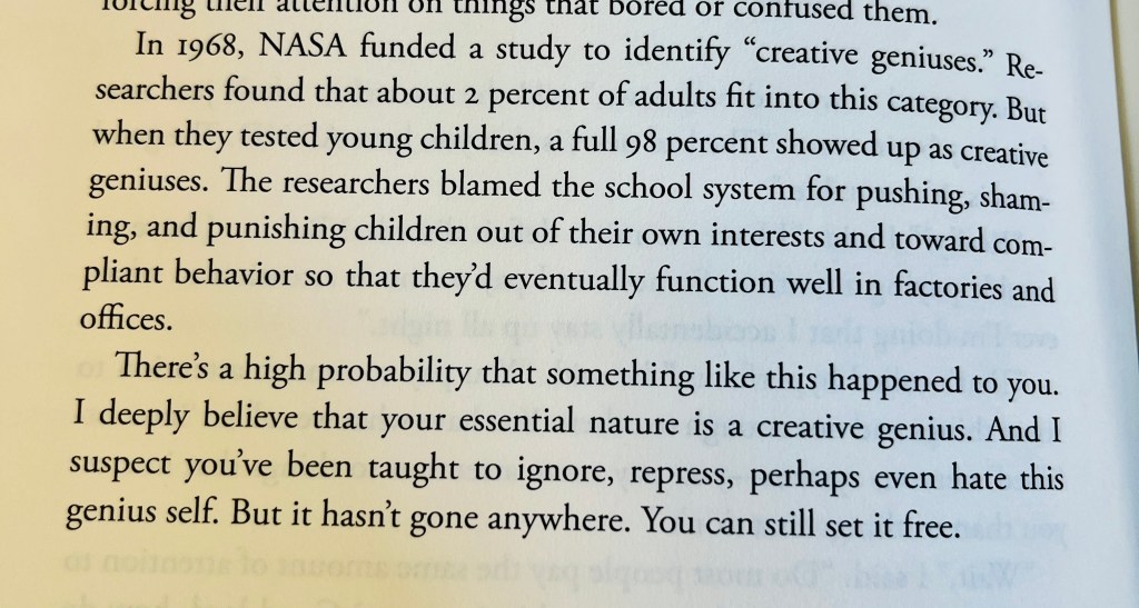 That segment about the creative geniuses was profound – but not surprising. Funny…I was talking about this just the other day with my two friends (husband and wife) who were Montessori school teachers. The difference in that type of education (Waldorf, too) and public schools is huge. Public schooling doesn’t allow for any outside-the-box thinking or creativity. Every child has to perform the same. Let’s get those numbers up for standardized testing! I was telling my friends that when Philip was in Kindergarten, his teacher called me one day to “complain” that Philip didn’t color his tree exactly the way she wanted him to. He used different colors. I was like, “So what? He was using the colors HE wanted to and was being creative!” She sternly said, “Those were not my instructions and that’s the whole point.” WOW. Looking back over his entire school experience, I know that he was a gifted child and that the public school system totally stifled him. Even when he was in 1st grade, he used to beg me to homeschool him. I knew at the time that I just couldn’t do it. :-(