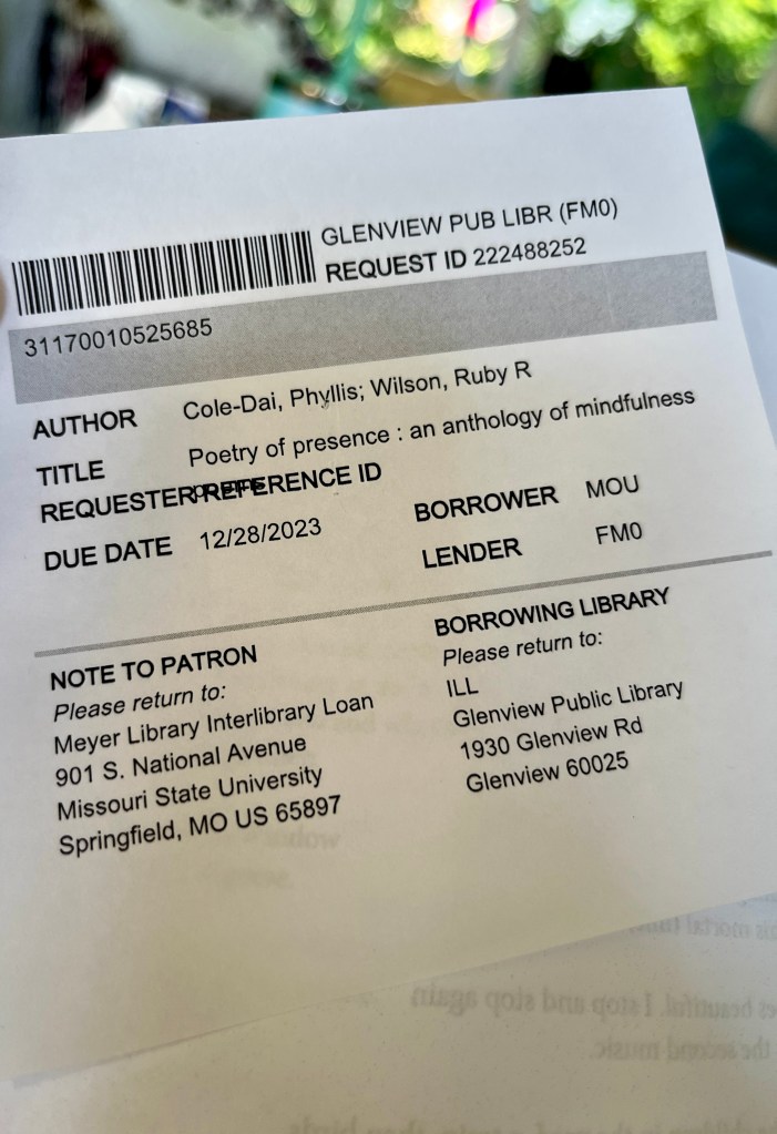 over the weekend, i was reading poetry of presence, another library book i’d requested. when i got to page 35, this little piece of paper fell out. you know how i feel about finding slips of paper in library books — i’ve even written about it a couple of times before. i studied it, looking for anything that might hold some meaning.