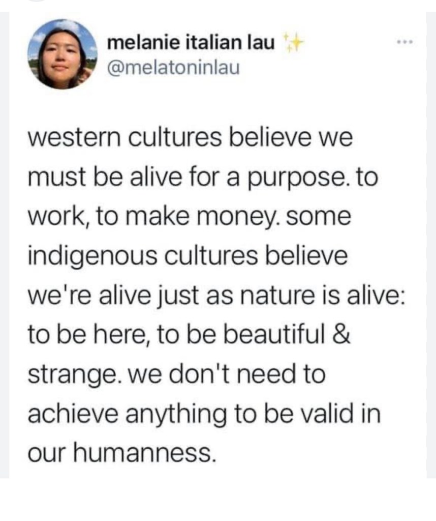 When I read that quote, I thought about how far we’ve strayed from simply being. How even suggesting we’re not here just to work feels almost childlike. And how, when I say it out loud, people look at me with pity. Like the desire to rest means I don’t understand how the world works.