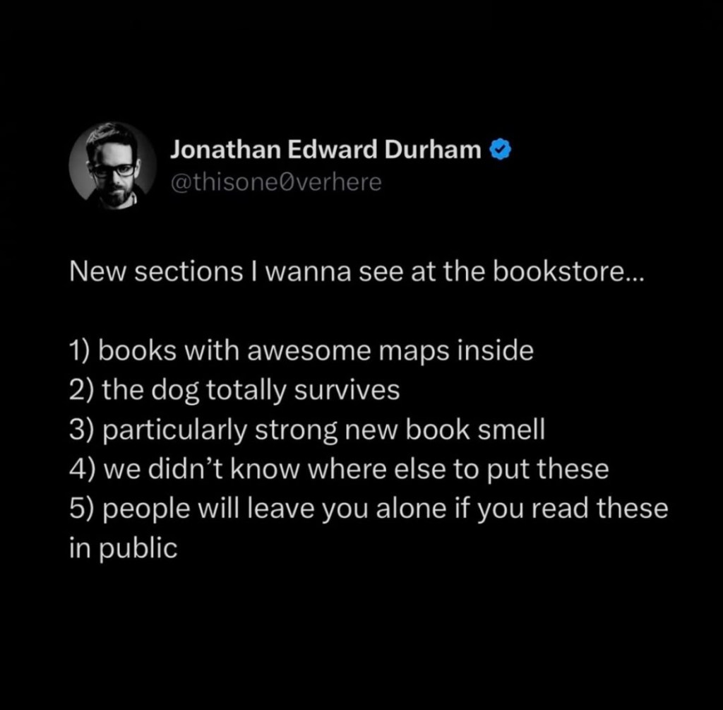 Sections of a bookstore is great! Not only maps, but can we please have more books that have a genealogy chart in the front to keep track of the novel’s characters??