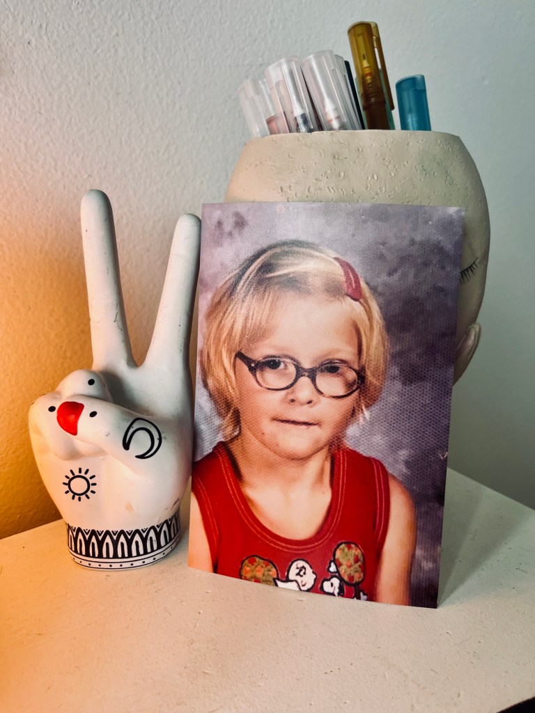 Isn’t it cool when a plant flowers for the first time? I had that happen to my rosemary this year. I’ve had that plant in my window for like 10 years! I love that picture of little Kari. Between the look on your face and the glasses, it so much reminds me of Middle Child. There’s such a sweet vulnerability about it. Also, the picture of you hugging your younger version is priceless. I’ve seen people do that on TikTok with their children who never got to meet their grandparents. It makes me cry, it’s just so beautiful.