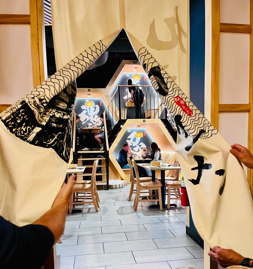 I thought I should give it a caption because without context, it might be a bit confusing. We were at a ramen restaurant with friends and had our own private room. Our husbands were holding back the curtains to show the rest of the restaurant.