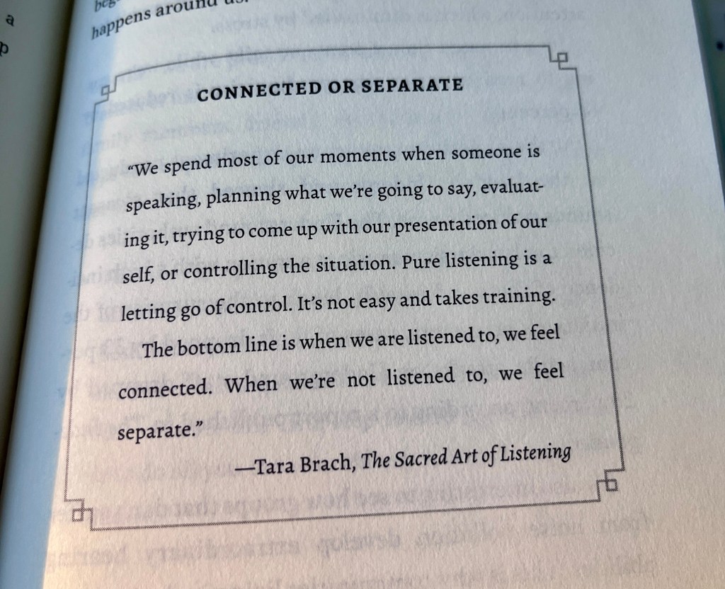 I love Tara’s books and have learned so much from her. I’m also learning, slowly, how to be a better listener. Honestly, I think listening should be taught in school. It really is an art form.
