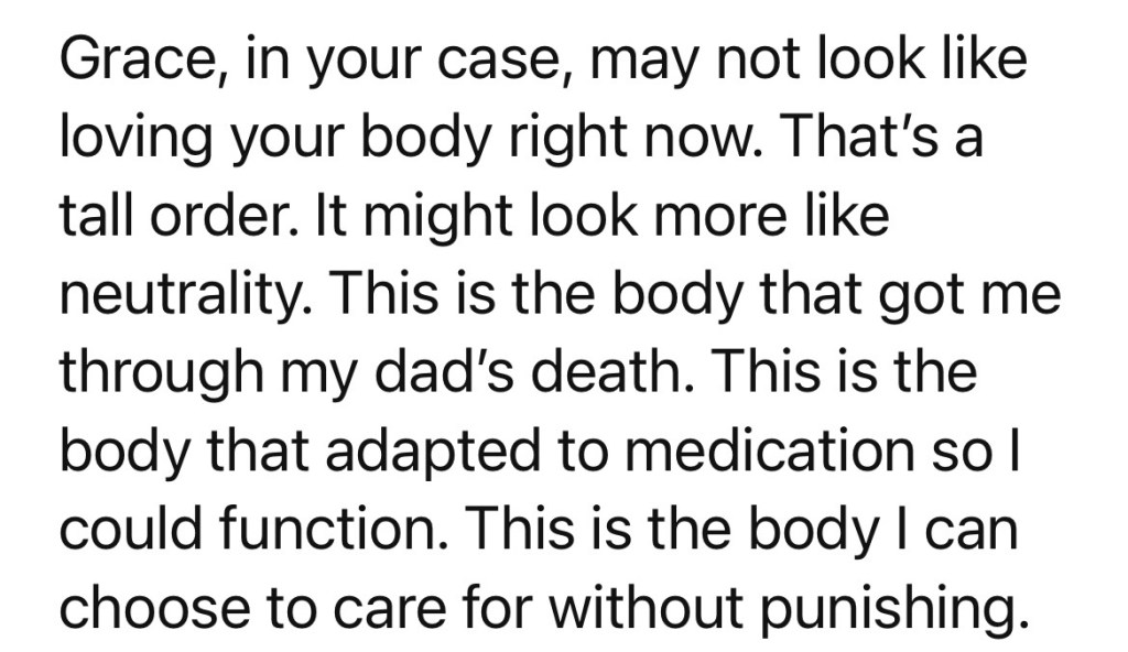 Neutrality toward the body is an excellent choice. Grief changes us in so many ways, and physically is one of them. Grace towards ourselves is a beautiful thing. Those we’ve lost would want it for us.