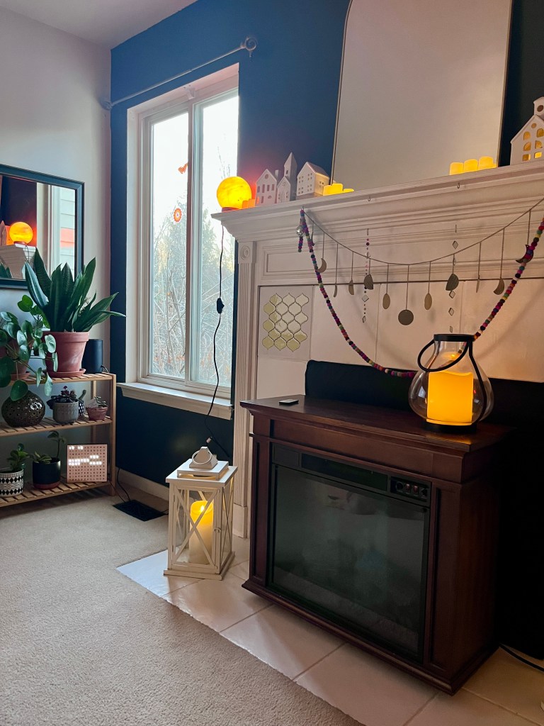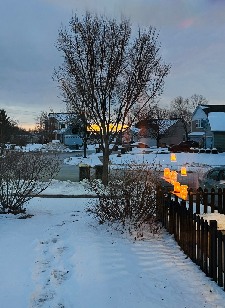 Your glowing lights and fireplace are so welcoming. And that purple sky is incredible. I hope you have a happy week!