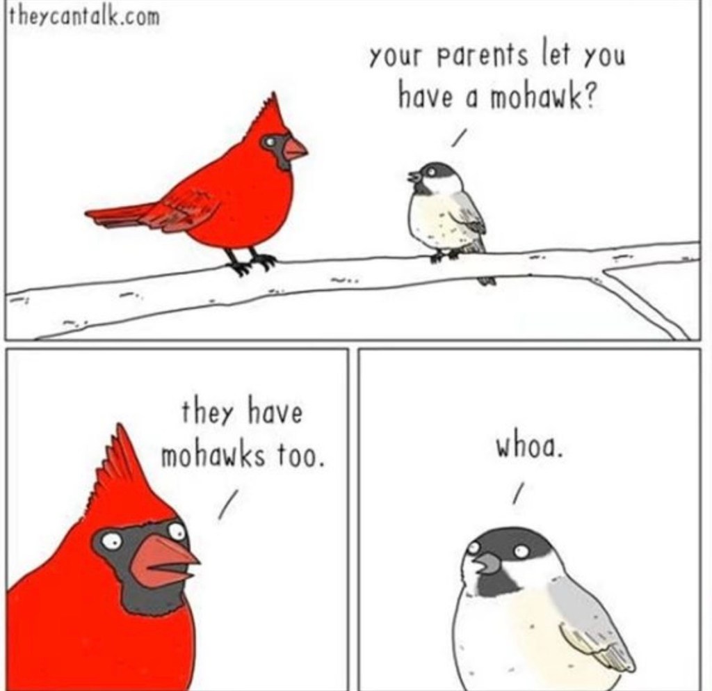 Lots of good stuff! I laughed at the cardinal and mohawks.