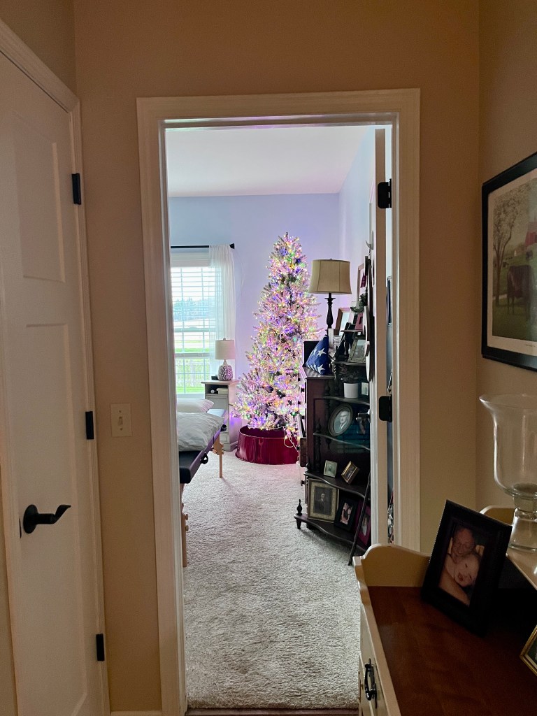 In early April, we were at mom’s for dinner when I noticed the Christmas tree lights were on in the den. I assumed my mom had turned them on earlier while she was cleaning or getting things ready. Later, Ella came in from the bathroom and said, “Oh Mamie, I love that you have the Christmas tree lights on.”